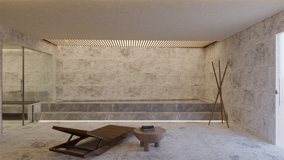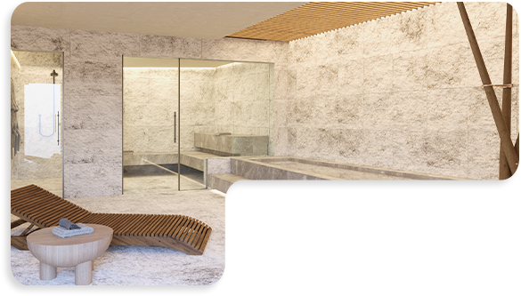 Ambiente de descanso com Espreguiçadeiras, sauna a vapor e SPA com hidromassagem.